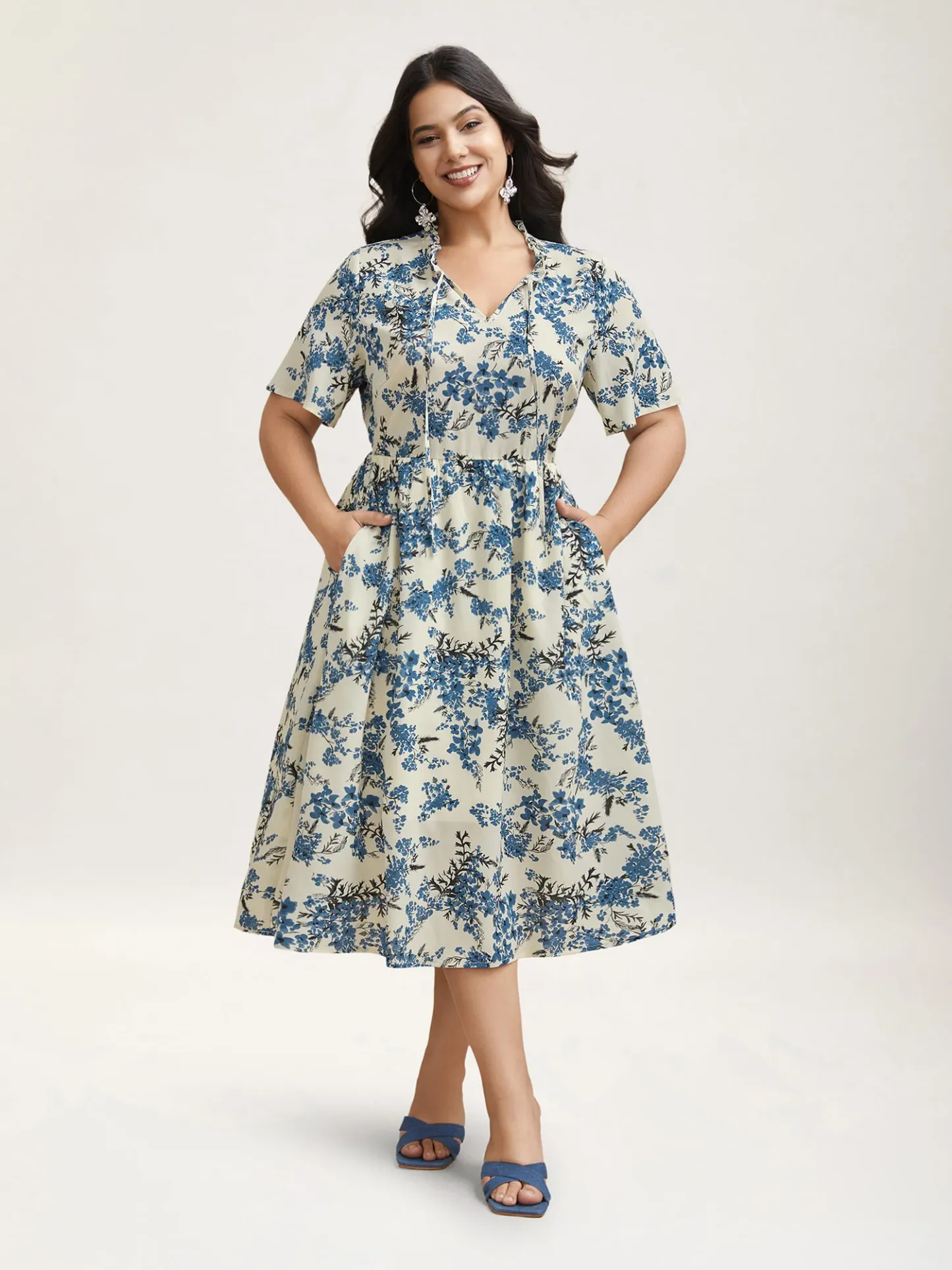 In Full Bloom Notched Collar Pockets Midi Dress