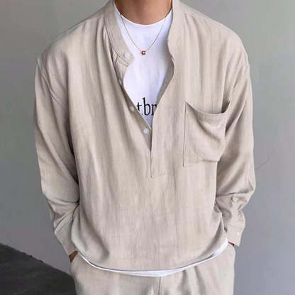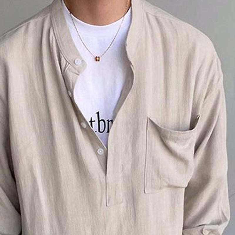 Drawing inspiration from the city's vibrant streets and dynamic energy, James envisions a shirt that seamlessly transitions from day to night, from the boardroom to the bar. Thus, the Men's Casual Solid Color Henley Collar Long Sleeve Shirt is born – a versatile piece that exudes understated elegance and modern flair.