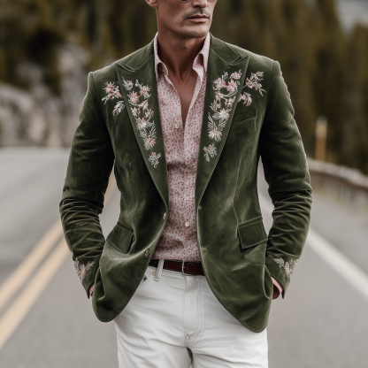 Men's Classic Retro Western Style Suede Embroidered Single-breasted Blazer