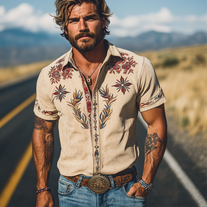 Step into the season with style in the Men's Spring/Summer Fashion Retro Western Style Suede Embroidered Short Sleeve Shirt. Combining retro western charm with modern fashion sensibilities, this shirt is designed for those who appreciate timeless style. Crafted with high-quality materials, it offers a luxurious feel and exceptional comfort, making it a perfect choice for warm weather outings.