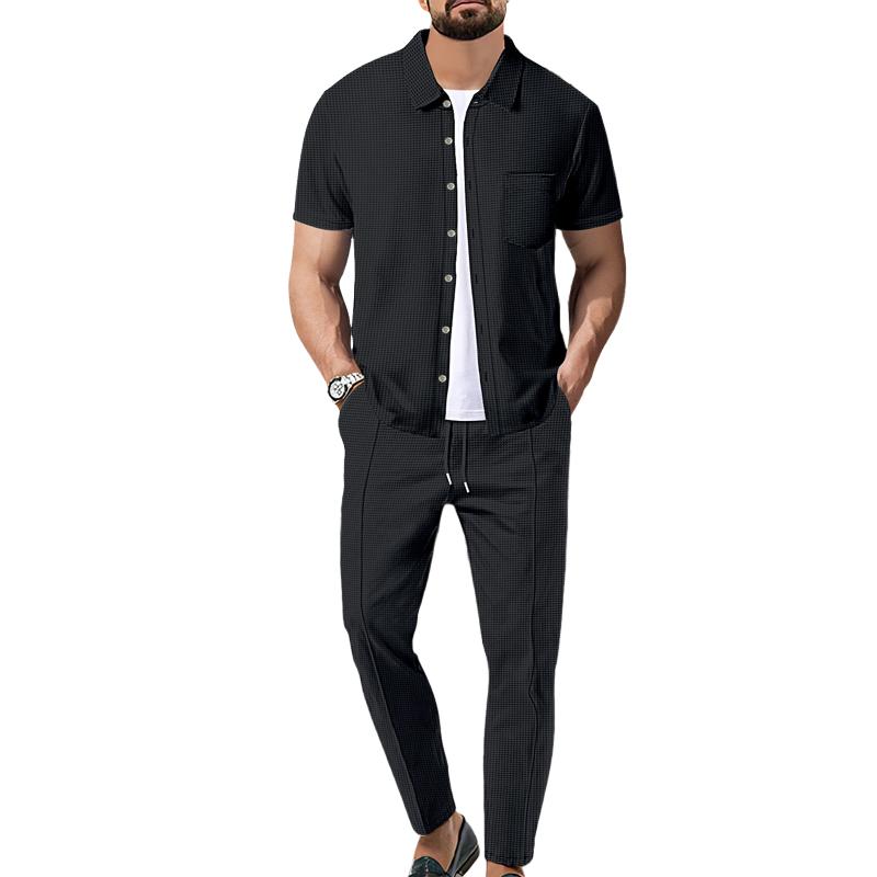 Men's Waffle Solid Color Short Sleeve Shirt and Pants Set